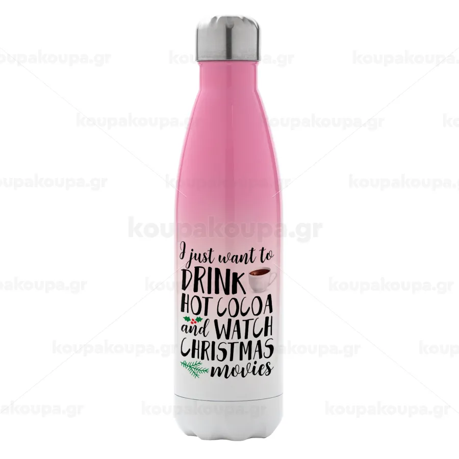 I just want to drink hot cocoa and watch christmas movies, Μεταλλικό παγούρι θερμός Ροζ/Λευκό (Stainless steel), διπλού τοιχώματος, 500ml