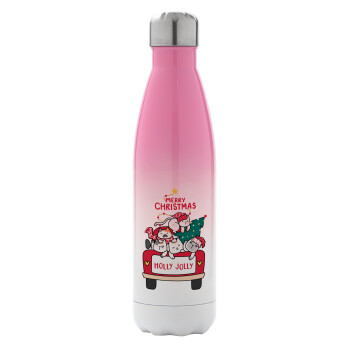 Merry Christmas cats in car, Μεταλλικό παγούρι θερμός Ροζ/Λευκό (Stainless steel), διπλού τοιχώματος, 500ml