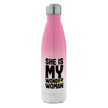 She is my wonder woman, Μεταλλικό παγούρι θερμός Ροζ/Λευκό (Stainless steel), διπλού τοιχώματος, 500ml