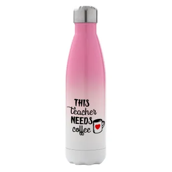 Τhis teacher needs coffee, Μεταλλικό παγούρι θερμός Ροζ/Λευκό (Stainless steel), διπλού τοιχώματος, 500ml