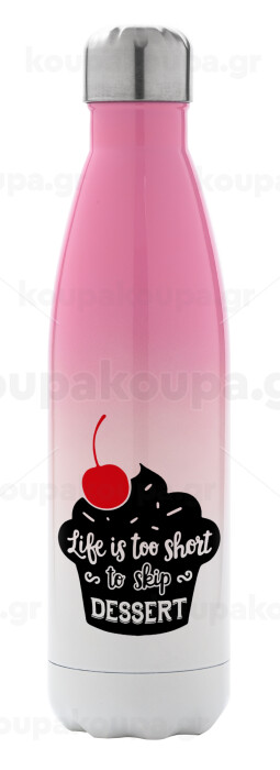 Life is too short, to skip Dessert, Μεταλλικό παγούρι θερμός Ροζ/Λευκό (Stainless steel), διπλού τοιχώματος, 500ml