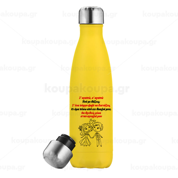 Σ΄ αγαπώ σ΄ αγαπώ που με βάζεις, Μεταλλικό παγούρι θερμός Κίτρινος (Stainless steel), διπλού τοιχώματος, 500ml