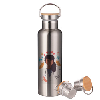 Ευχαριστώ για όλα γιατρέ, Μεταλλικό παγούρι θερμός (Stainless steel) Ασημένιο με ξύλινο καπακι (bamboo), διπλού τοιχώματος, 750ml