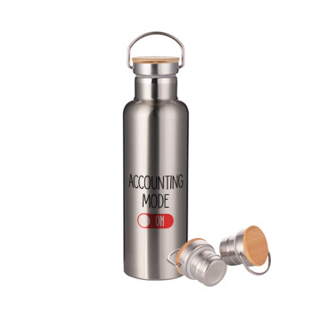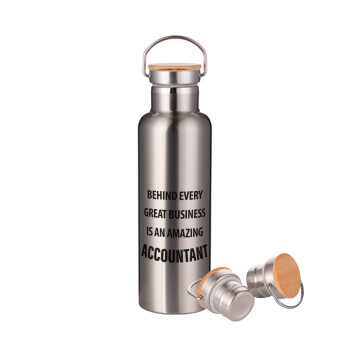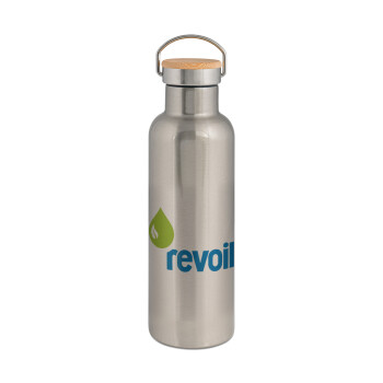 Πρατήριο καυσίμων ETEKA, Μεταλλικό παγούρι θερμός (Stainless steel) Ασημένιο με ξύλινο καπακι (bamboo), διπλού τοιχώματος, 750ml