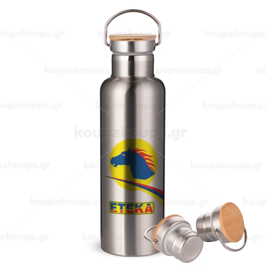 Πρατήριο καυσίμων ETEKA, Μεταλλικό παγούρι θερμός (Stainless steel) Ασημένιο με ξύλινο καπακι (bamboo), διπλού τοιχώματος, 750ml