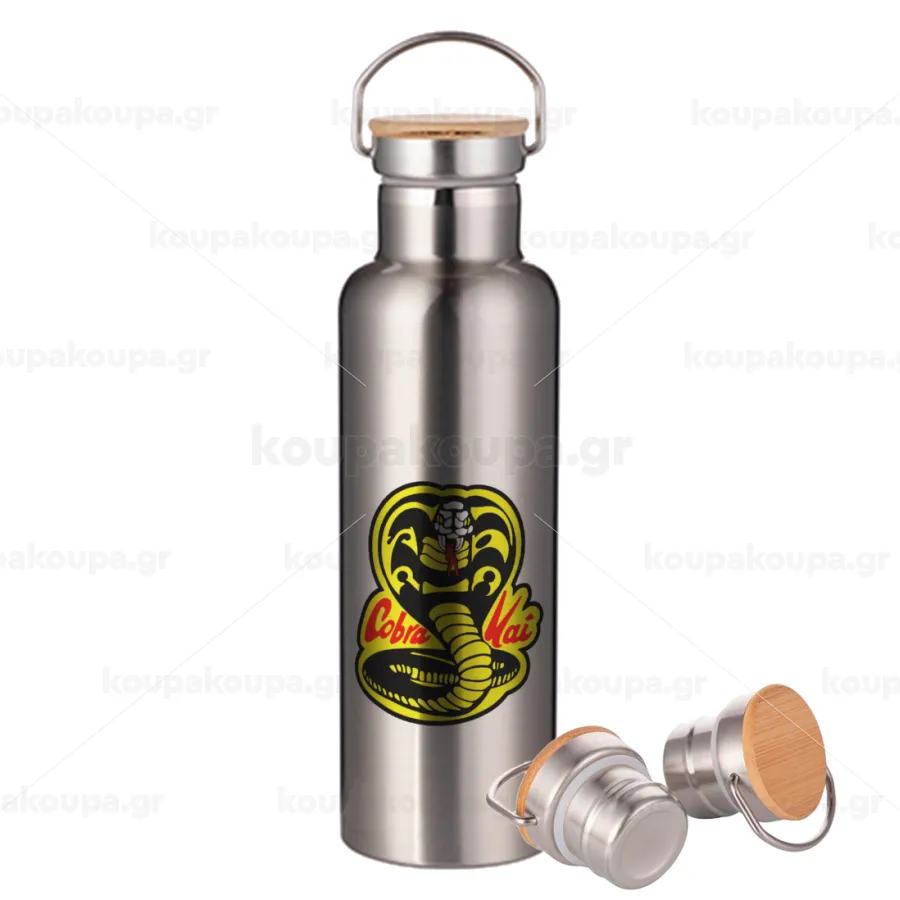 Cobra Kai Yellow, Μεταλλικό παγούρι θερμός (Stainless steel) Ασημένιο με ξύλινο καπακι (bamboo), διπλού τοιχώματος, 750ml