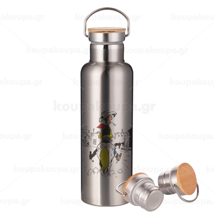 Λούκυ Λουκ comic, Μεταλλικό παγούρι θερμός (Stainless steel) Ασημένιο με ξύλινο καπακι (bamboo), διπλού τοιχώματος, 750ml