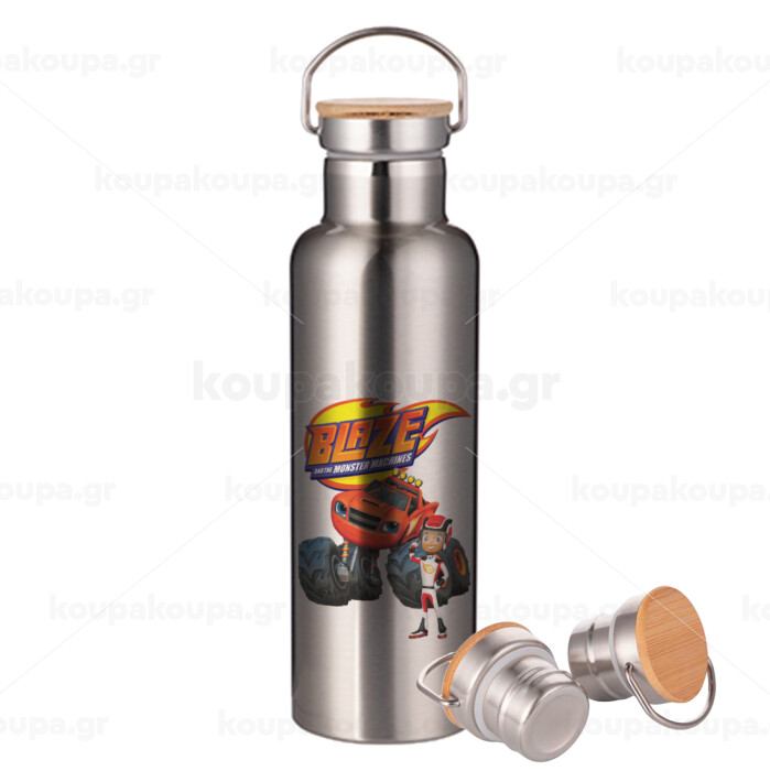 Ο Μπλέιζ και οι Φίλοι του, Μεταλλικό παγούρι θερμός (Stainless steel) Ασημένιο με ξύλινο καπακι (bamboo), διπλού τοιχώματος, 750ml