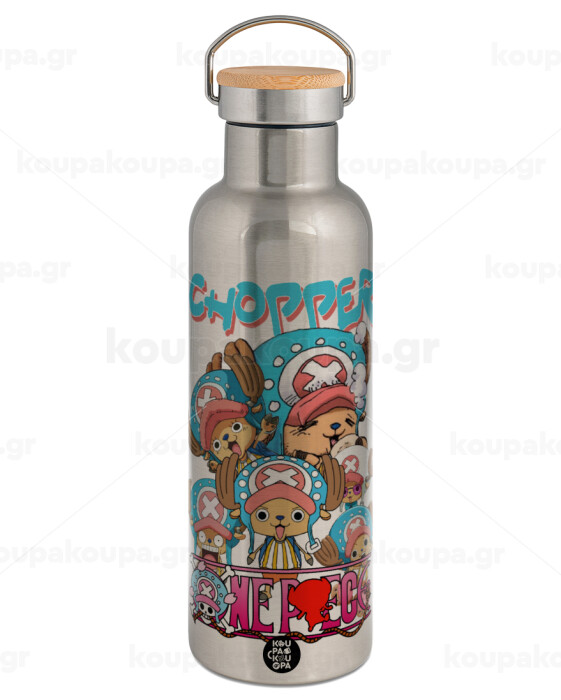 Chopper One Piece, Μεταλλικό παγούρι θερμός (Stainless steel) Ασημένιο με ξύλινο καπακι (bamboo), διπλού τοιχώματος, 750ml