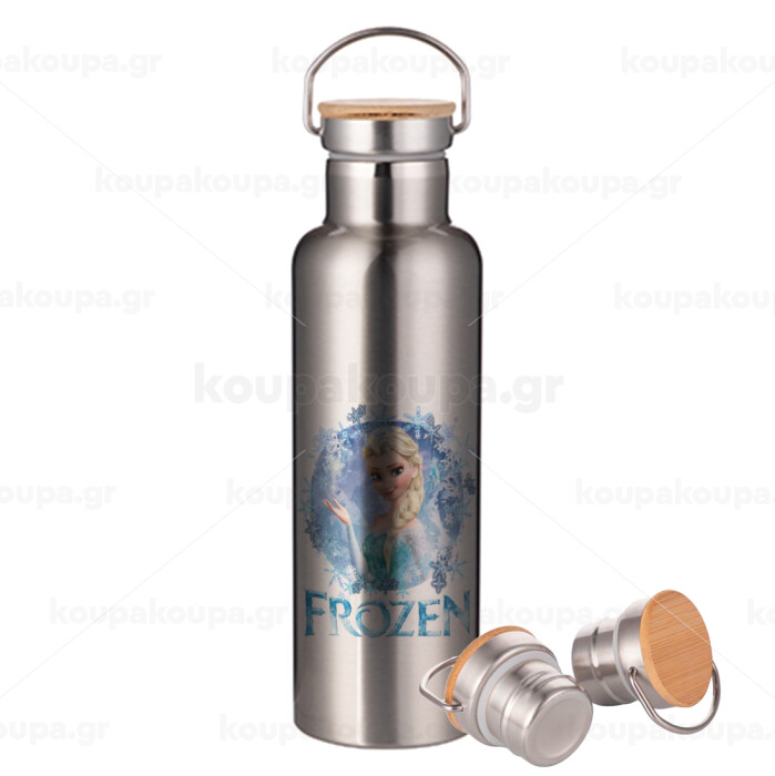 Frozen Elsa, Μεταλλικό παγούρι θερμός (Stainless steel) Ασημένιο με ξύλινο καπακι (bamboo), διπλού τοιχώματος, 750ml