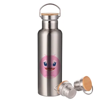 Lilo & Stitch Angel pink, Μεταλλικό παγούρι θερμός (Stainless steel) Ασημένιο με ξύλινο καπακι (bamboo), διπλού τοιχώματος, 750ml