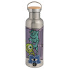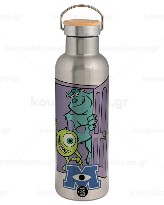 Monster inc, Μεταλλικό παγούρι θερμός (Stainless steel) Ασημένιο με ξύλινο καπακι (bamboo), διπλού τοιχώματος, 750ml