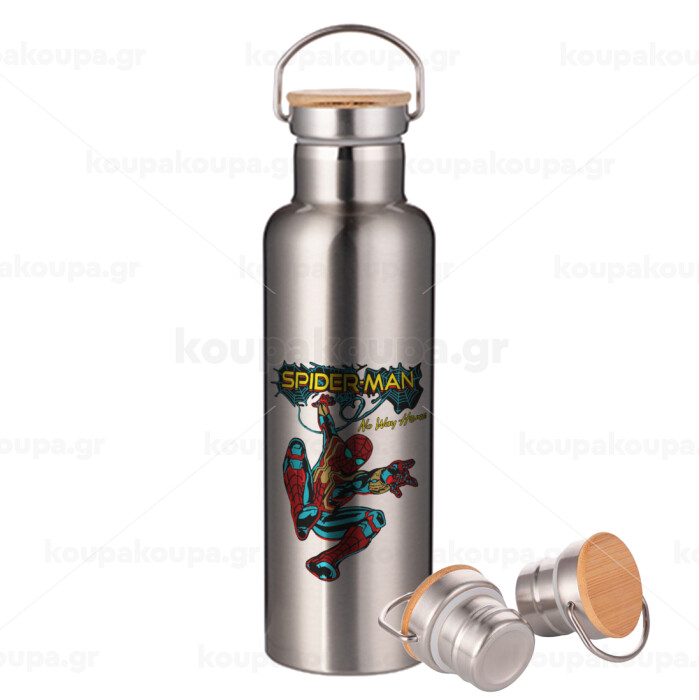 Spiderman no way home, Μεταλλικό παγούρι θερμός (Stainless steel) Ασημένιο με ξύλινο καπακι (bamboo), διπλού τοιχώματος, 750ml