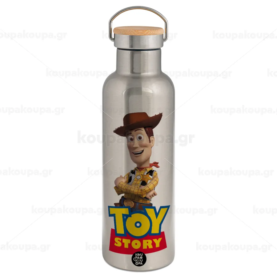 Woody cowboy, Μεταλλικό παγούρι θερμός (Stainless steel) Ασημένιο με ξύλινο καπακι (bamboo), διπλού τοιχώματος, 750ml