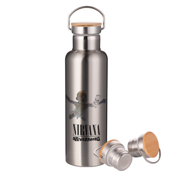 Nirvana nevermind, Μεταλλικό παγούρι θερμός (Stainless steel) Ασημένιο με ξύλινο καπακι (bamboo), διπλού τοιχώματος, 750ml