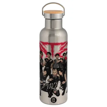Stray Kids k-pop band, Μεταλλικό παγούρι θερμός (Stainless steel) Ασημένιο με ξύλινο καπακι (bamboo), διπλού τοιχώματος, 750ml