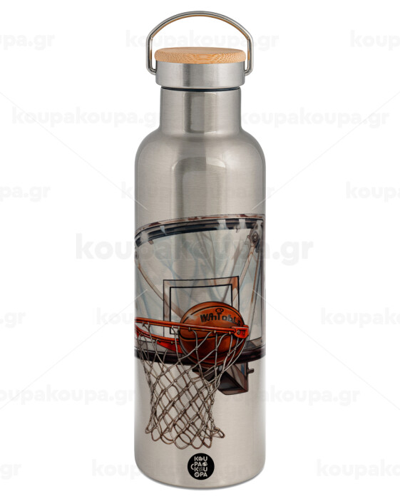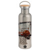 Basketball, Μεταλλικό παγούρι θερμός (Stainless steel) Ασημένιο με ξύλινο καπακι (bamboo), διπλού τοιχώματος, 750ml