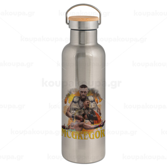 Conor McGregor Notorious, Μεταλλικό παγούρι θερμός (Stainless steel) Ασημένιο με ξύλινο καπακι (bamboo), διπλού τοιχώματος, 750ml