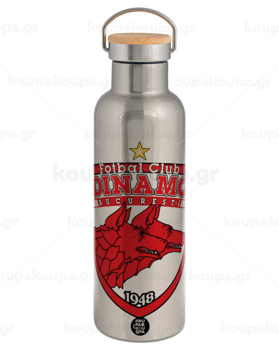 FC Dinamo Bucuresti, Μεταλλικό παγούρι θερμός (Stainless steel) Ασημένιο με ξύλινο καπακι (bamboo), διπλού τοιχώματος, 750ml