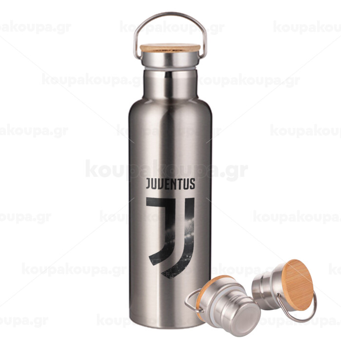 FC Juventus, Μεταλλικό παγούρι θερμός (Stainless steel) Ασημένιο με ξύλινο καπακι (bamboo), διπλού τοιχώματος, 750ml