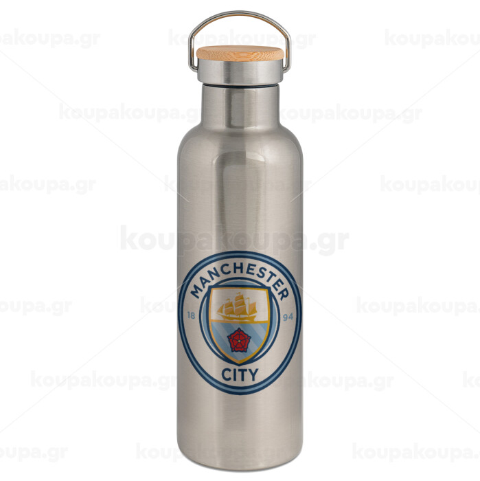 Manchester City FC , Μεταλλικό παγούρι θερμός (Stainless steel) Ασημένιο με ξύλινο καπακι (bamboo), διπλού τοιχώματος, 750ml