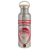 Olympiacos B.C., Μεταλλικό παγούρι θερμός (Stainless steel) Ασημένιο με ξύλινο καπακι (bamboo), διπλού τοιχώματος, 750ml