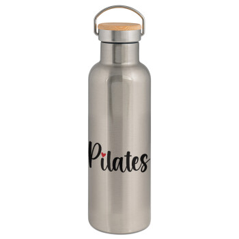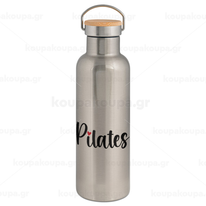 Pilates love, Μεταλλικό παγούρι θερμός (Stainless steel) Ασημένιο με ξύλινο καπακι (bamboo), διπλού τοιχώματος, 750ml
