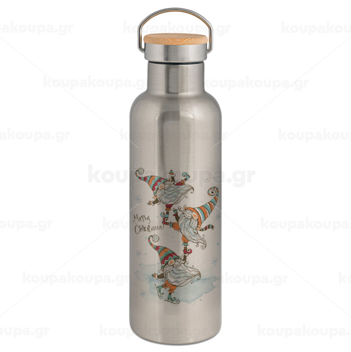 Christmas nordic gnomes, Μεταλλικό παγούρι θερμός (Stainless steel) Ασημένιο με ξύλινο καπακι (bamboo), διπλού τοιχώματος, 750ml