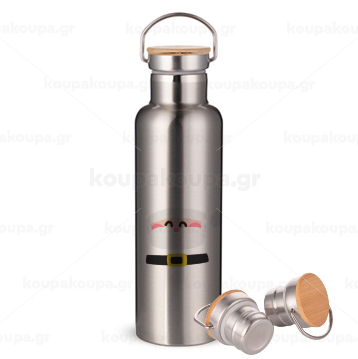 Simple Santa, Μεταλλικό παγούρι θερμός (Stainless steel) Ασημένιο με ξύλινο καπακι (bamboo), διπλού τοιχώματος, 750ml