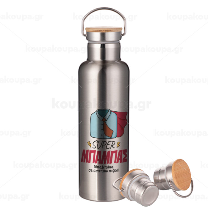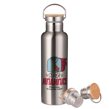 SUPER ΜΠΑΜΠΑΣ, Μεταλλικό παγούρι θερμός (Stainless steel) Ασημένιο με ξύλινο καπακι (bamboo), διπλού τοιχώματος, 750ml