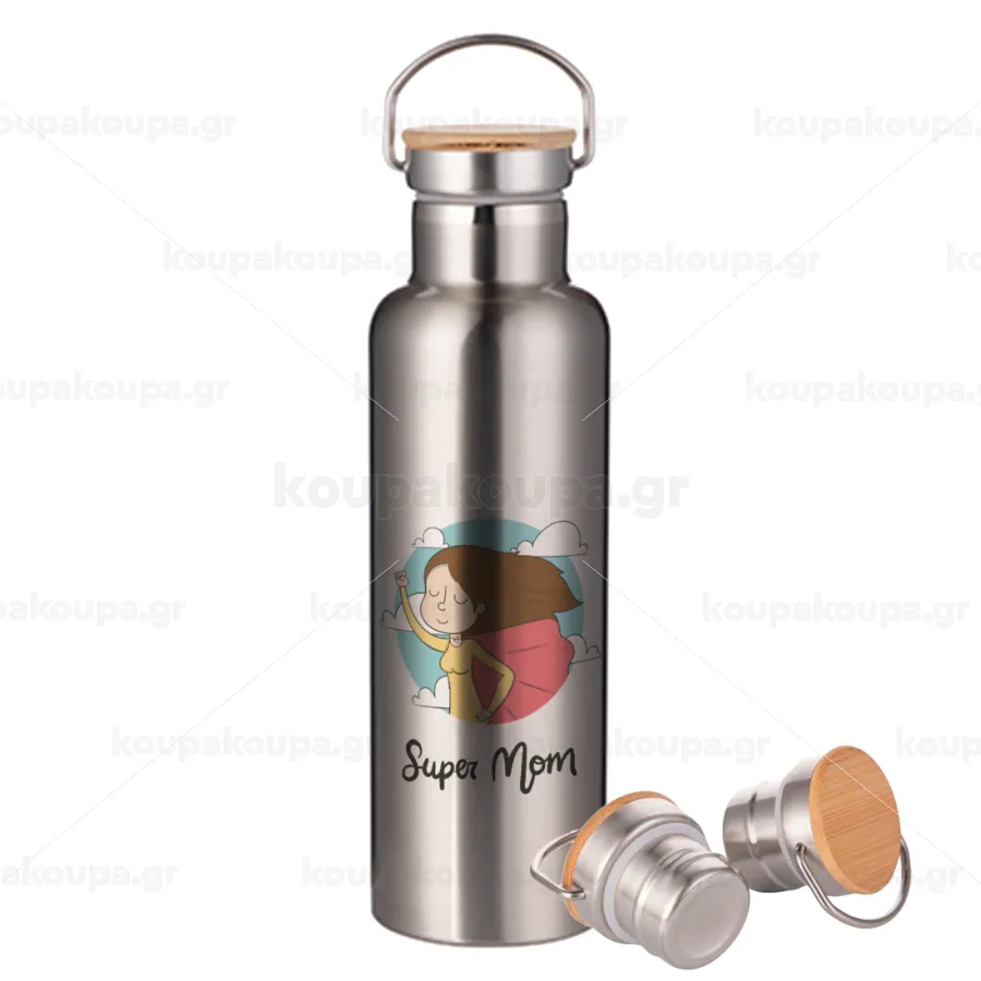 Super mom, Μεταλλικό παγούρι θερμός (Stainless steel) Ασημένιο με ξύλινο καπακι (bamboo), διπλού τοιχώματος, 750ml