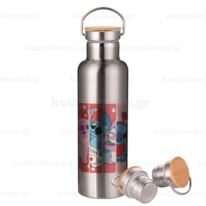 Lilo & Stitch Love, Μεταλλικό παγούρι θερμός (Stainless steel) Ασημένιο με ξύλινο καπακι (bamboo), διπλού τοιχώματος, 750ml