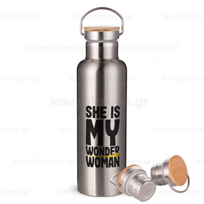 She is my wonder woman, Μεταλλικό παγούρι θερμός (Stainless steel) Ασημένιο με ξύλινο καπακι (bamboo), διπλού τοιχώματος, 750ml