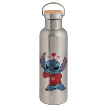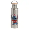 Stitch heart, Μεταλλικό παγούρι θερμός (Stainless steel) Ασημένιο με ξύλινο καπακι (bamboo), διπλού τοιχώματος, 750ml