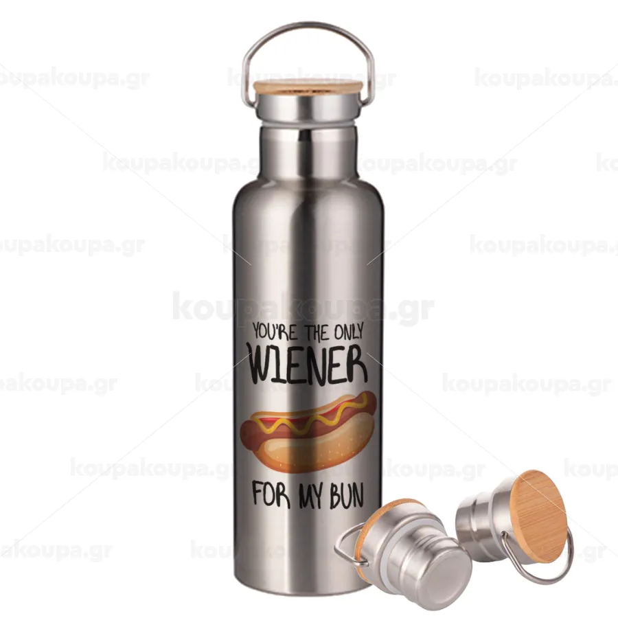 You re the only wiener for my bun, Μεταλλικό παγούρι θερμός (Stainless steel) Ασημένιο με ξύλινο καπακι (bamboo), διπλού τοιχώματος, 750ml