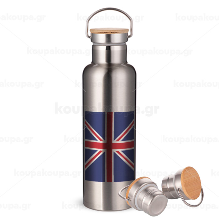 Σημαία Αγγλίας UK, Μεταλλικό παγούρι θερμός (Stainless steel) Ασημένιο με ξύλινο καπακι (bamboo), διπλού τοιχώματος, 750ml