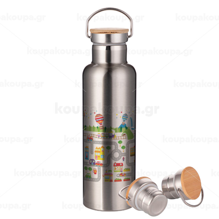 City road track maps, Μεταλλικό παγούρι θερμός (Stainless steel) Ασημένιο με ξύλινο καπακι (bamboo), διπλού τοιχώματος, 750ml