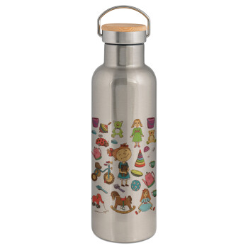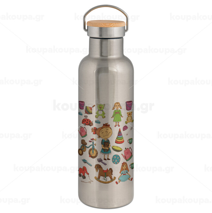 Toys Girl, Μεταλλικό παγούρι θερμός (Stainless steel) Ασημένιο με ξύλινο καπακι (bamboo), διπλού τοιχώματος, 750ml