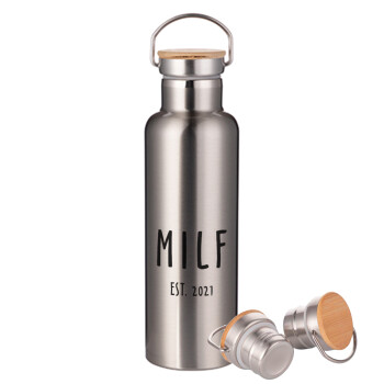 MILF, Μεταλλικό παγούρι θερμός (Stainless steel) Ασημένιο με ξύλινο καπακι (bamboo), διπλού τοιχώματος, 750ml