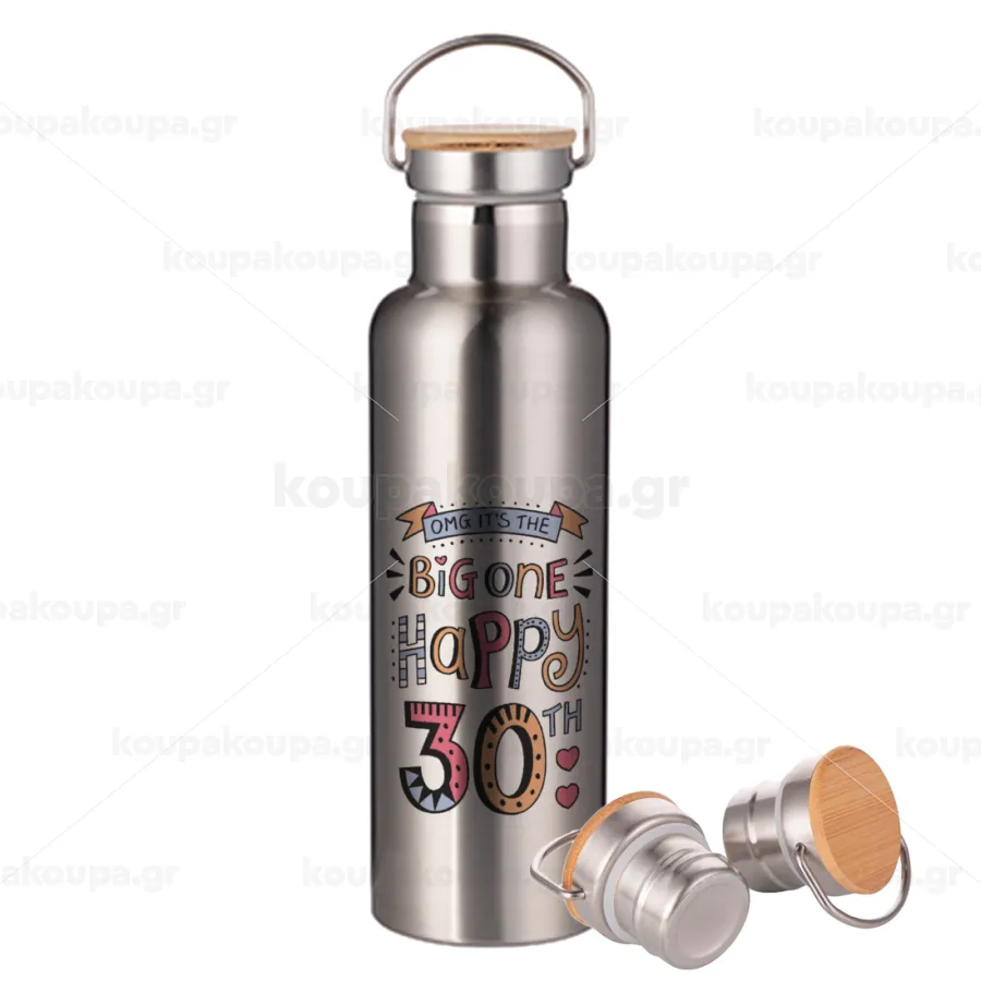 Big one Happy 30th, Μεταλλικό παγούρι θερμός (Stainless steel) Ασημένιο με ξύλινο καπακι (bamboo), διπλού τοιχώματος, 750ml