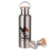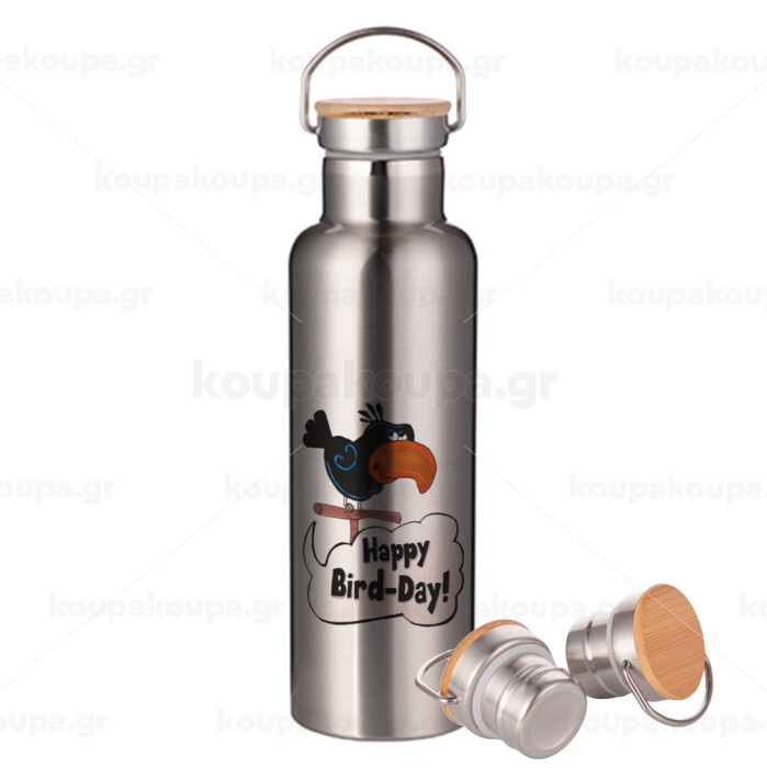 Happy Bird Day, Μεταλλικό παγούρι θερμός (Stainless steel) Ασημένιο με ξύλινο καπακι (bamboo), διπλού τοιχώματος, 750ml