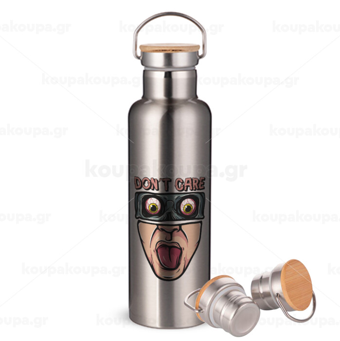 Don't Care, Μεταλλικό παγούρι θερμός (Stainless steel) Ασημένιο με ξύλινο καπακι (bamboo), διπλού τοιχώματος, 750ml