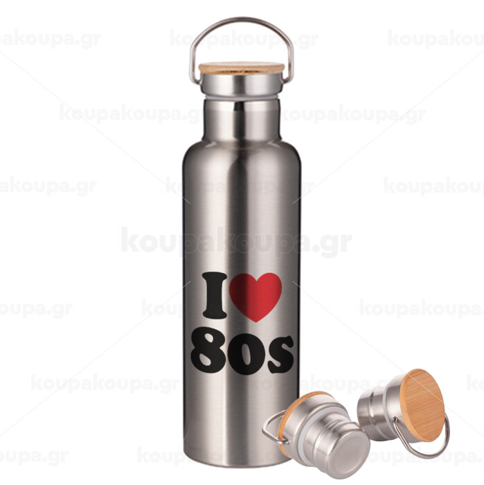 I Love 80s, Μεταλλικό παγούρι θερμός (Stainless steel) Ασημένιο με ξύλινο καπακι (bamboo), διπλού τοιχώματος, 750ml