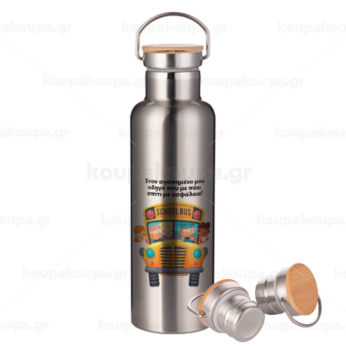 Στον αγαπημένο μου οδηγό που με πάει σπίτι με ασφάλεια!, Μεταλλικό παγούρι θερμός (Stainless steel) Ασημένιο με ξύλινο καπακι (bamboo), διπλού τοιχώματος, 750ml