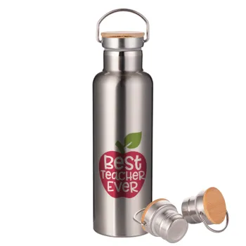 best teacher ever, apple!, Μεταλλικό παγούρι θερμός (Stainless steel) Ασημένιο με ξύλινο καπακι (bamboo), διπλού τοιχώματος, 750ml