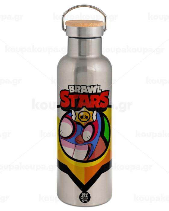 Brawl Stars El primo, Μεταλλικό παγούρι θερμός (Stainless steel) Ασημένιο με ξύλινο καπακι (bamboo), διπλού τοιχώματος, 750ml