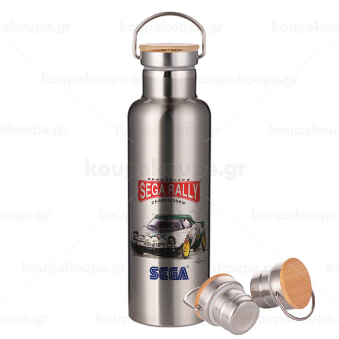 SEGA RALLY 2, Μεταλλικό παγούρι θερμός (Stainless steel) Ασημένιο με ξύλινο καπακι (bamboo), διπλού τοιχώματος, 750ml