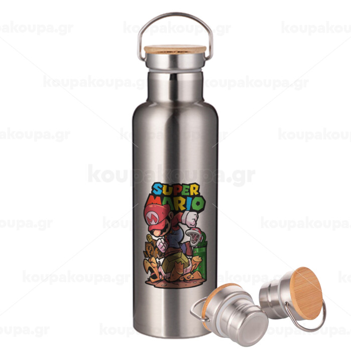 Super mario Jump, Μεταλλικό παγούρι θερμός (Stainless steel) Ασημένιο με ξύλινο καπακι (bamboo), διπλού τοιχώματος, 750ml