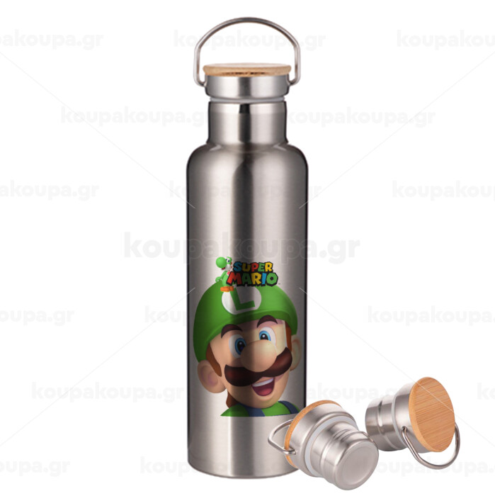 Super mario Luigi, Μεταλλικό παγούρι θερμός (Stainless steel) Ασημένιο με ξύλινο καπακι (bamboo), διπλού τοιχώματος, 750ml