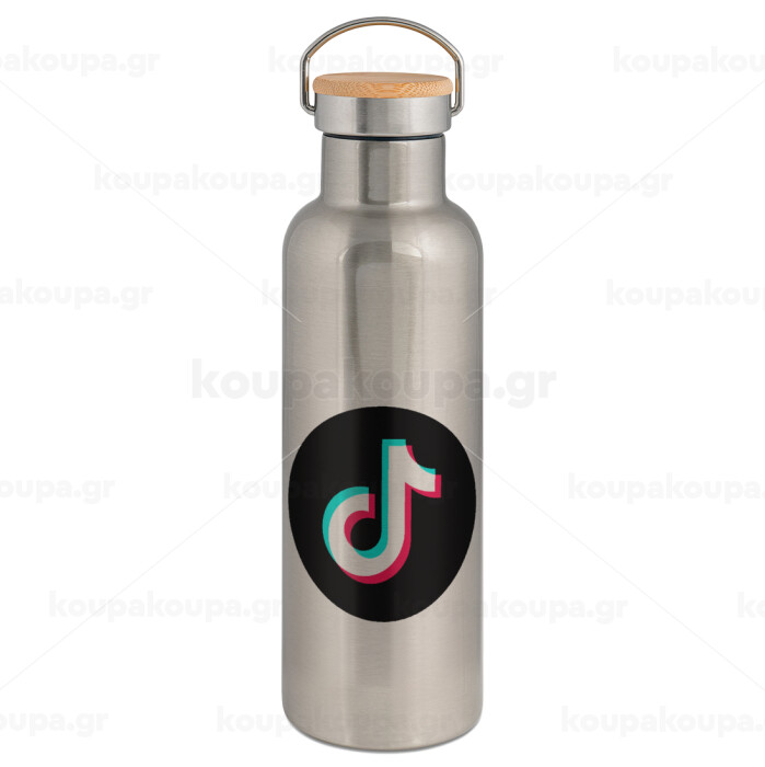 TikTok, Μεταλλικό παγούρι θερμός (Stainless steel) Ασημένιο με ξύλινο καπακι (bamboo), διπλού τοιχώματος, 750ml